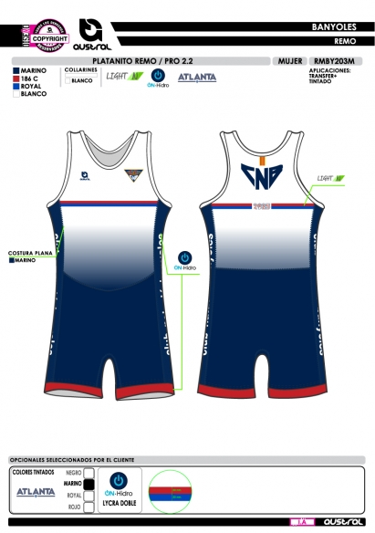 • Uso: Ideal para competiciones como uniforme oficial de club de remo. También es apto para entrenamientos, lo que le confiere gran versatilidad.