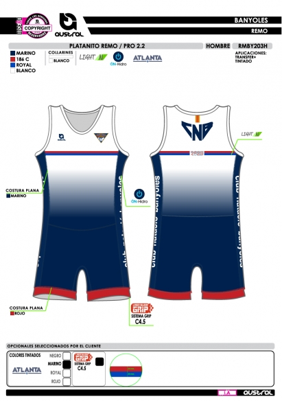 • Uso: Ideal para competiciones como uniforme oficial de club de remo. También es apto para entrenamientos, lo que le confiere gran versatilidad.