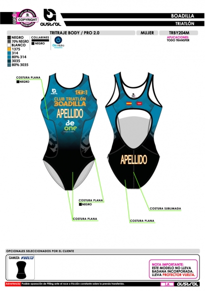 No olvide guardar su personalización para poder añadirla al carrito. En caso de no llevarla indicar "Sin Nombre" o "Sin Número" según proceda en la casilla correspondiente.- Nombre del Producto: Tritraje Body PRO 2.0.