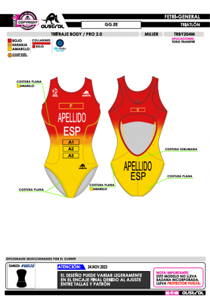 Revise bien la información incluida. La misma será trasladada a las prendas en los mismos términos no siendo Austral responsable de los errores ortográficos o de normativa. Se aplicará la normativa específica de cada deporte para las competiciones nacionales.