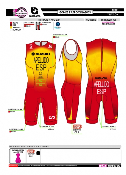 El tritraje patrocinado Ayudas de Viaje para GGEE/ÉLITE /JUNIOR/SUB 23 cuenta con un precio más económico, debido a la presencia de patrocinadores de la FETRI que aparecen en el diseño y abaratan el coste del mismo