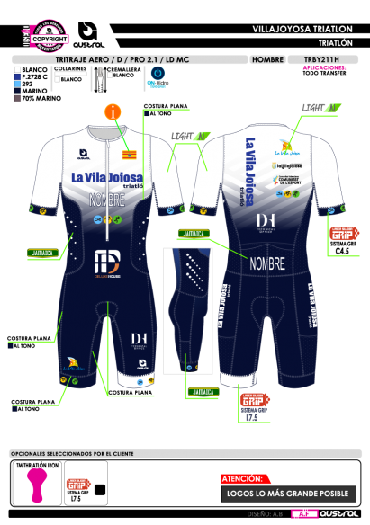 No olvide guardar su personalización para poder añadirla al carrito. En caso de no llevarla indicar "Sin Nombre" o "Sin Número" según proceda en la casilla correspondiente.· Nombre: Tritraje AERO D PRO 2.1 LD MC.